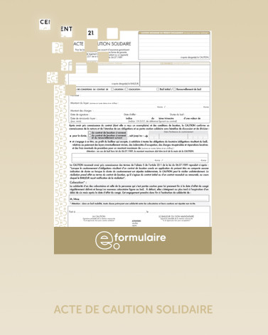 E-FORMULAIREActe de caution solidaire - En ligne5,90 € E-FORMULAIREActe de caution solidaire - En ligne5,90 €Prix Acte de caution solidaire - En ligne Le garant s'engage au profit du bailleur à satisfaire à toutes les obligations du locataire (résultant du...5,90 €Prix Acte de caution solidaire - En ligne Le garant s'engage au profit du bailleur à satisfaire à toutes les obligations du locataire (résultant du...5,90 €Prixremoveadd